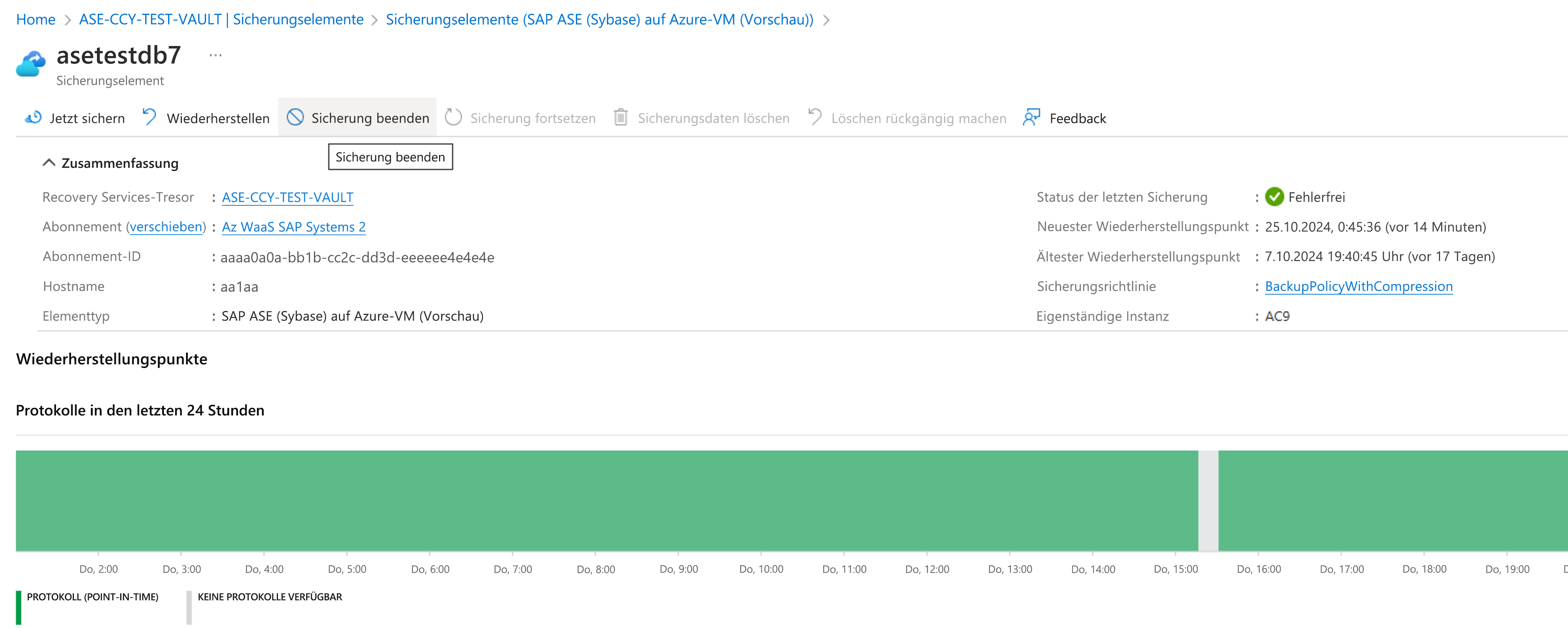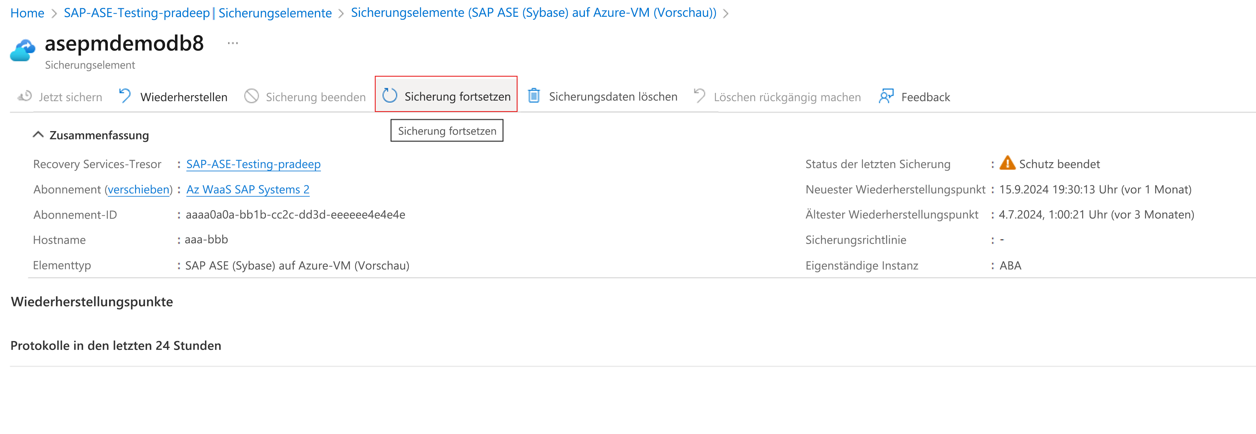 Fortsetzen des Schutzes für eine SAP ASE-Datenbank