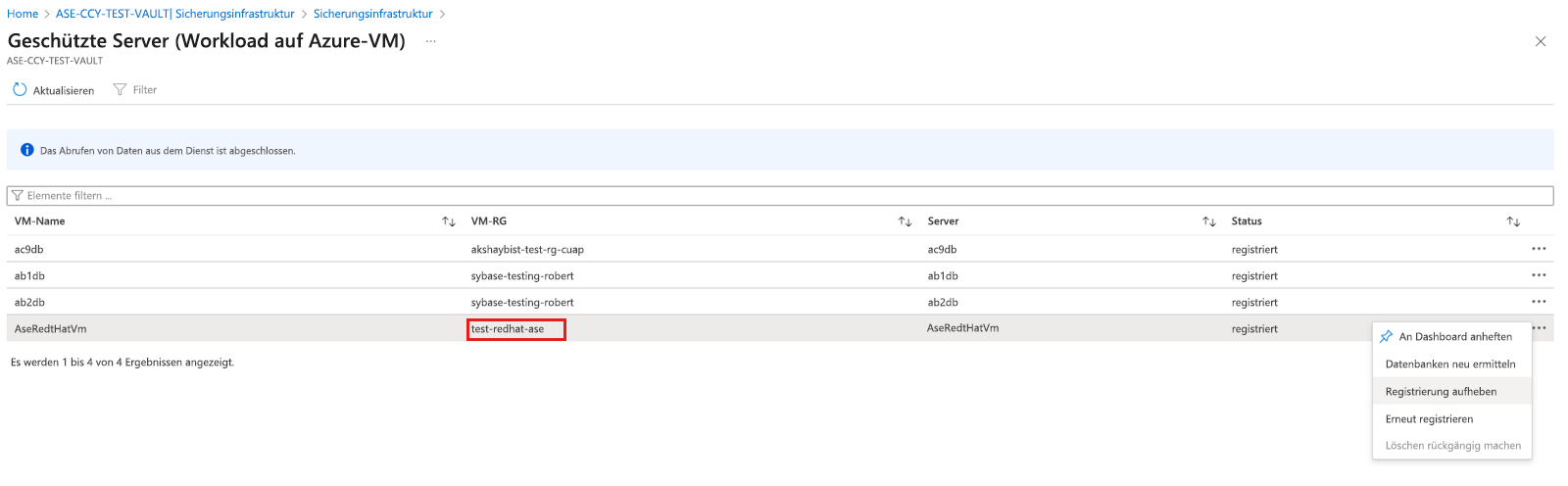 Wählen Sie im Bereich Geschützte Server die Instanz aus, deren Registrierung Sie aufheben möchten. Um den Tresor zu löschen, müssen Sie die Registrierung aller Server und Instanzen aufheben.