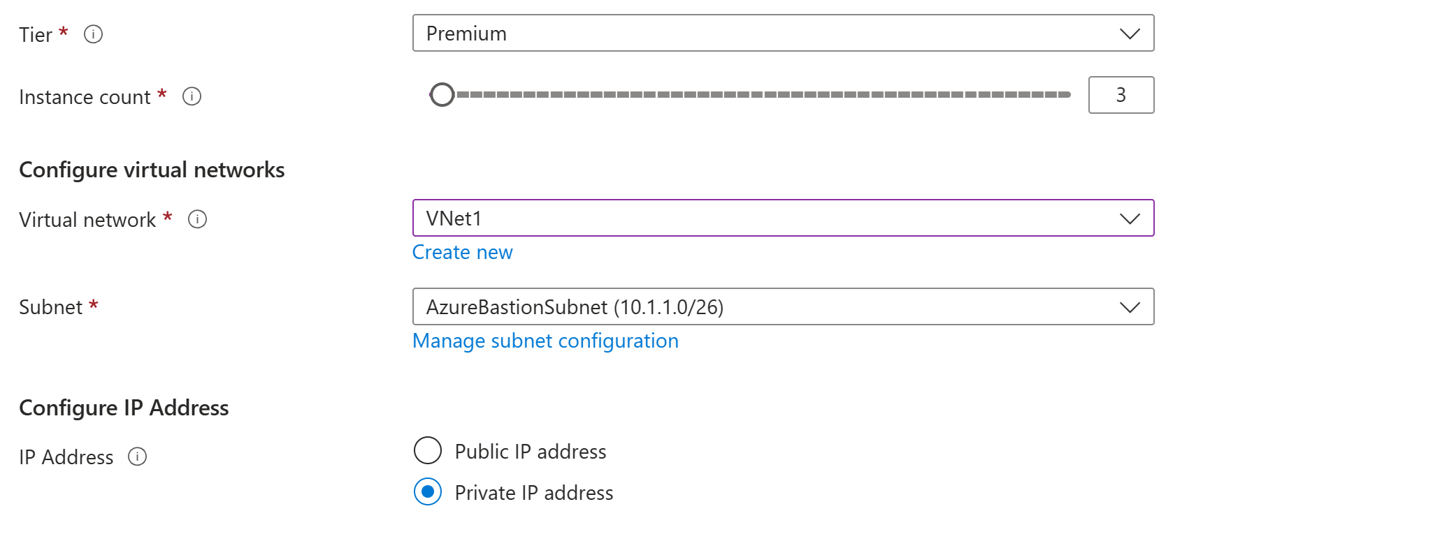 - Das Subnetz muss /26 oder größer sein (z. B. /26, /25 oder /24), um features aufzunehmen, die mit der Premium-SKU-Stufe verfügbar sind.