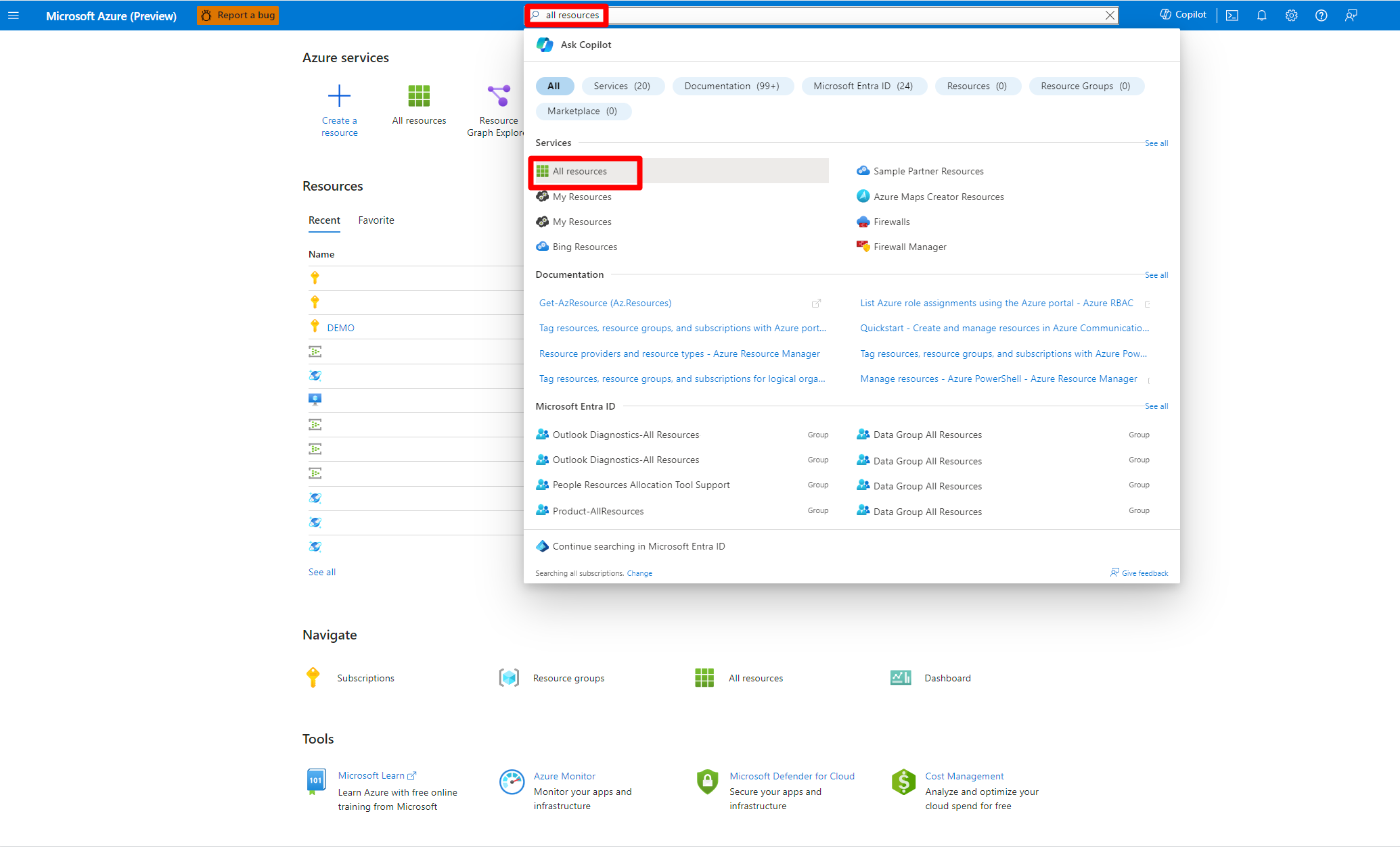 Suchen Sie nach Alle Ressourcen, und wählen Sie diese Option aus.