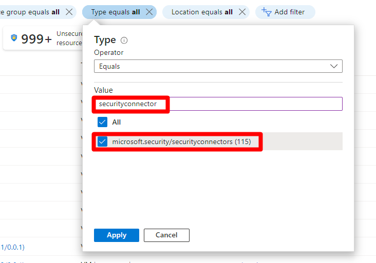 securityconnectorin das Wertfeld ein, und fügen Sie nebenmicrosoft.security/securityconnectorsein Häkchen hinzu.Wählen Sie Übernehmen.