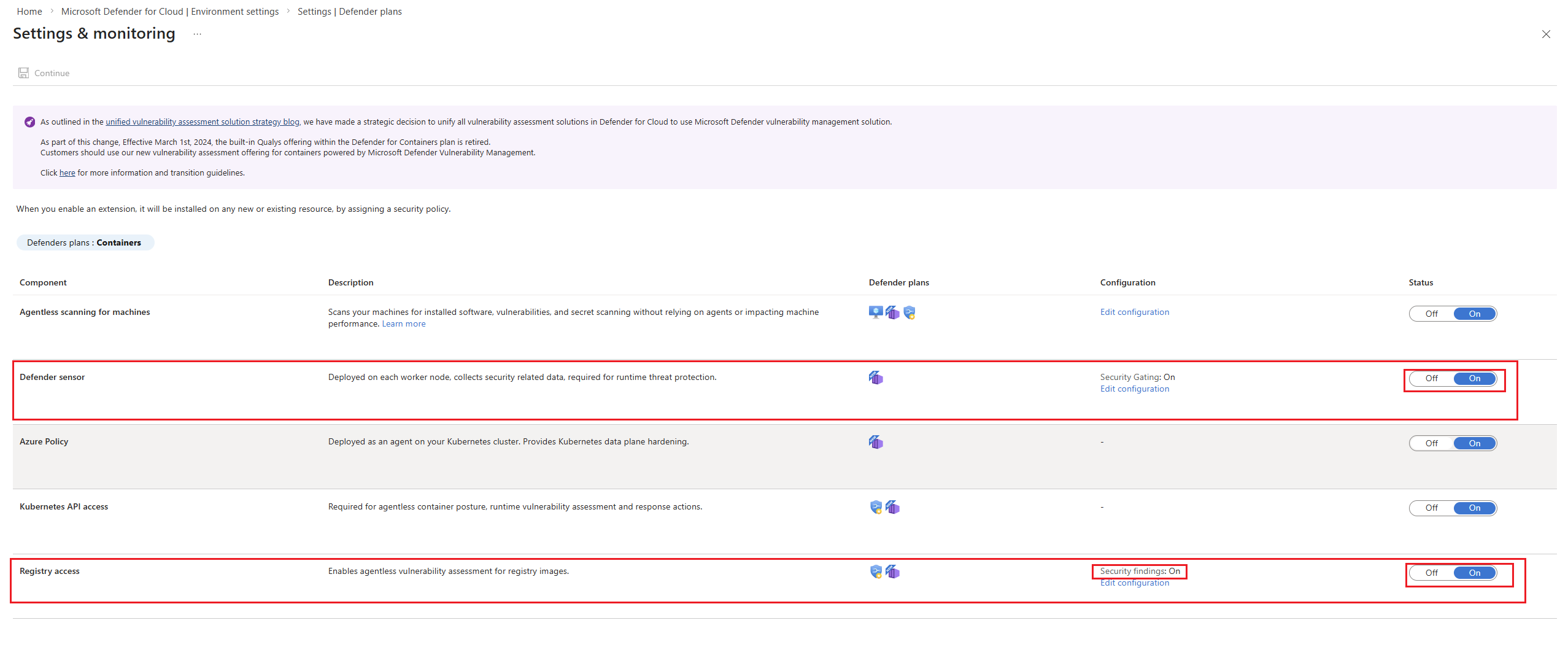 | Planen von Erweiterungen | Defender-Sensor, Sicherheitsbeschränkung, Sicherheitsergebnisse und Registrierungszugriff. Sie können diese Planerweiterungen in der Planeinstellung von Defender for Containers aktivieren oder deaktivieren. Sie sind standardmäßig in neuen Defender für Containerumgebungen aktiviert. |