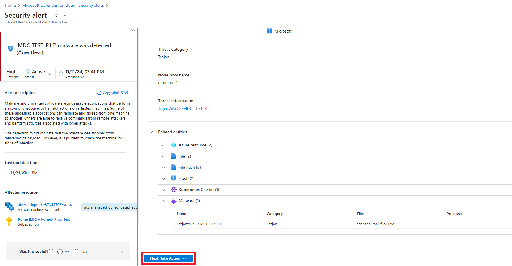 Die Sicherheitswarnung beschreibt die gefundene Schadsoftware, einschließlich der betroffenen Knotenpools und Schadsoftwaredateien. Wählen Sie die Schaltfläche Weiter: Aktion ausführen aus, um die Anweisungen zum Korrigieren der Bedrohung anzuzeigen.
