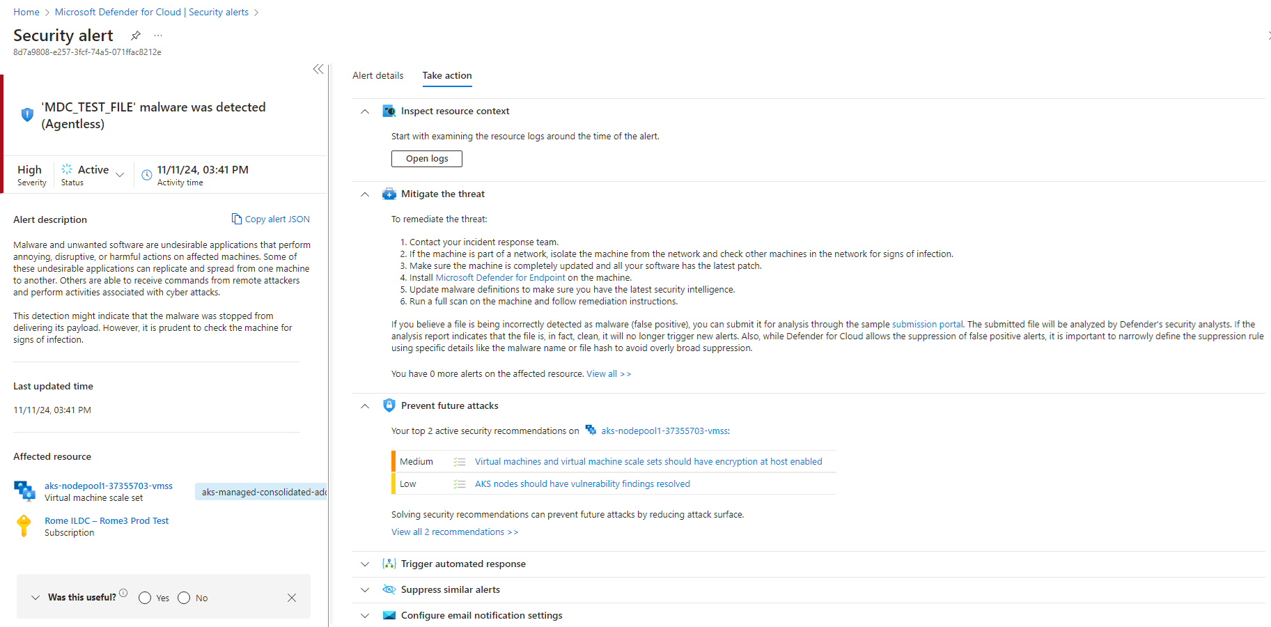 Wenn Schadsoftware in Kubernetes-Knoten ermittelt wird, wird eine Sicherheitswarnung generiert, die der Kunde überprüfen kann. So überprüfen Sie eine Sicherheitswarnung hinsichtlich Schadsoftware in Kubernetes-Knoten im Azure-Portal:
