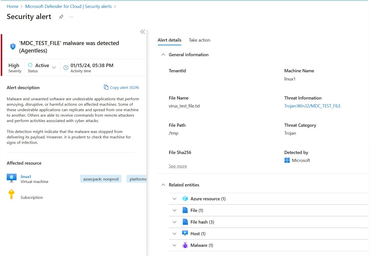 Die Warnung MDC_Test_File malware was detected (Agentless) wird innerhalb von 24 Stunden auf der Seite Defender for Cloud Warnungen und im Defender XDR-Portal angezeigt.