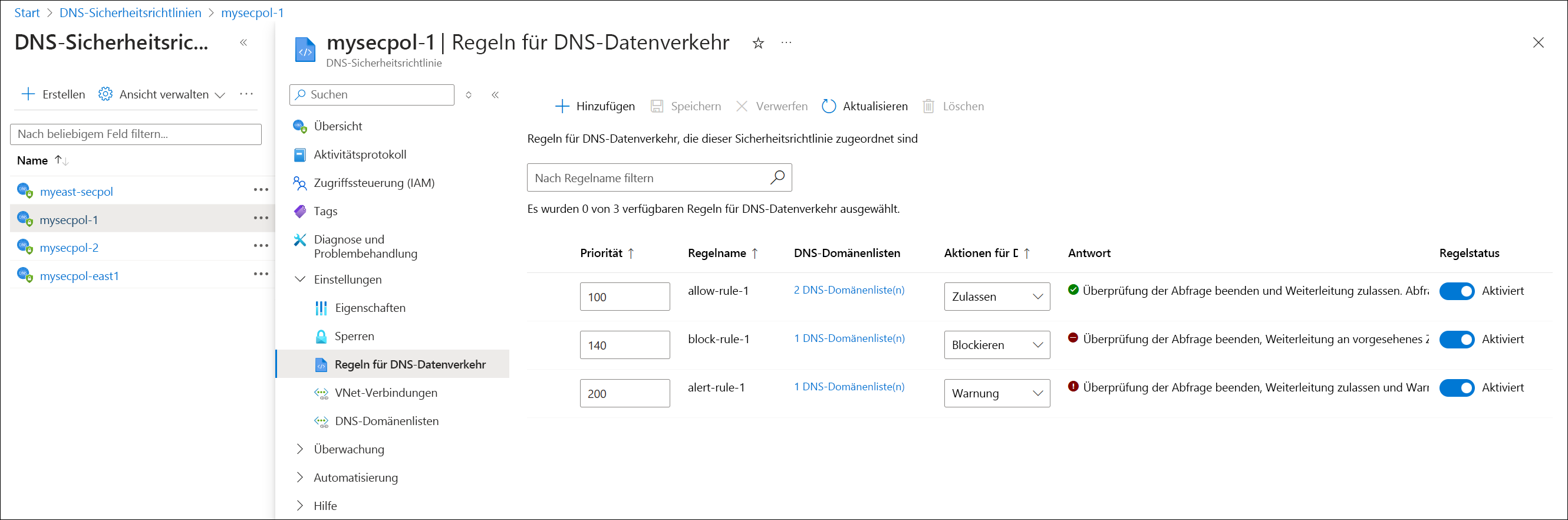 Wenn Sie eine DNS-Domänenliste im Azure-Portal anzeigen, können Sie auch Einstellungen>Zugeordnete DNS-Datenverkehrsregeln auswählen, um eine Liste aller Datenverkehrsregeln und der zugehörigen DNS-Sicherheitsrichtlinien anzuzeigen, die auf die DNS-Domänenliste verweisen.