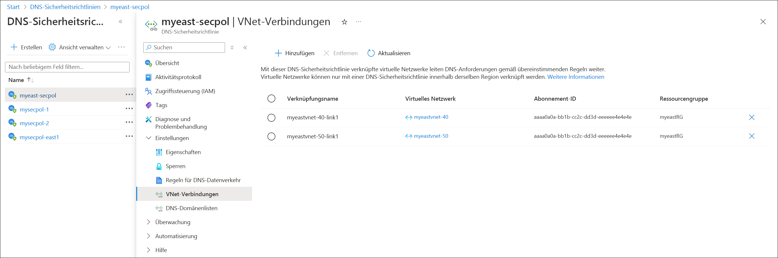 Das folgende Beispiel zeigt eine DNS-Sicherheitsrichtlinie, die mit zwei VNets verknüpft ist (myeastvnet-40 und myeastvnet-50):