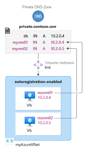 Eine DNS-Zone wird zum Hosten der DNS-Einträge für eine bestimmte Domäne verwendet. Wenn Sie eine Domäne in Azure DNS hosten möchten, müssen Sie eine DNS-Zone für diesen Domänennamen erstellen. Jeder DNS-Eintrag für Ihre Domäne wird dann in dieser DNS-Zone erstellt. Um eine private DNS-Zone in Ihrem virtuellen Netzwerk zu veröffentlichen, geben Sie die Liste mit den virtuellen Netzwerken an, für die das Auflösen von Einträgen in der Zone zulässig ist. Diese werden als verknüpfte virtuelle Netzwerke bezeichnet. Wenn die automatische Registrierung aktiviert ist, aktualisiert Azure DNS auch die Zoneneinträge, sobald ein virtueller Computer erstellt, seine IP-Adresse geändert oder der virtuelle Computer gelöscht wird.