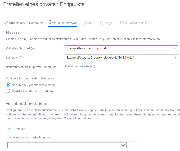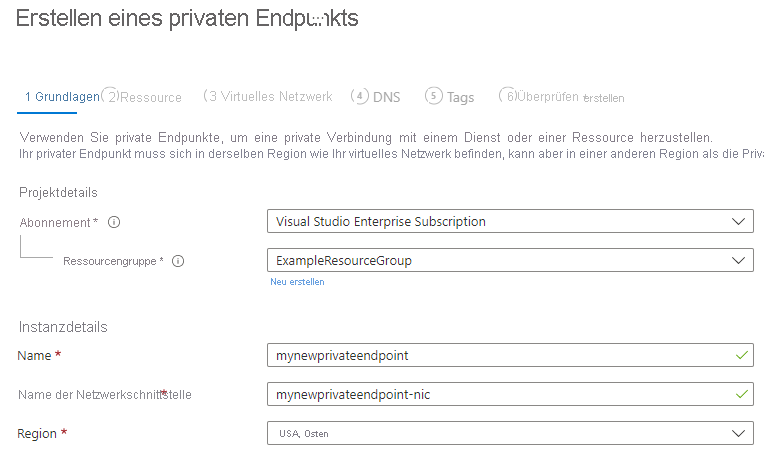 Lassen Sie Abonnement und Ressourcengruppe unverändert. Geben Sie unter Instanz einen Namen an, und wählen Sie eine Region für den neuen privaten Endpunkt aus. Ihr privater Endpunkt muss sich in derselben Region wie Ihr virtuelles Netzwerk befinden. Verwenden Sie daher die gleiche Region, die Sie beim Erstellen des virtuellen Computers angegeben haben. Wenn alle Felder ausgefüllt sind, wählen Sie Weiter: Ressource aus.