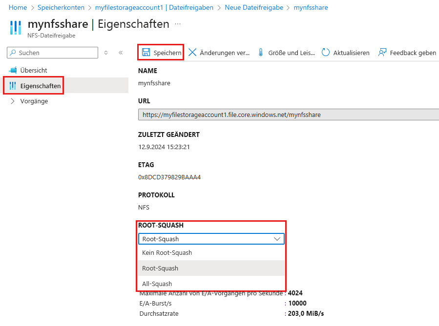 Root-Squash ist zwar das Standardverhalten in NFS, es ist aber nicht die Standardoption beim Erstellen einer NFS-Azure-Dateifreigabe. Root-Squash muss explizit für die Dateifreigabe aktiviert werden. Dieser Schritt kann beim Erstellen einer NFS-Azure-Dateifreigabe oder auch später durchgeführt werden.