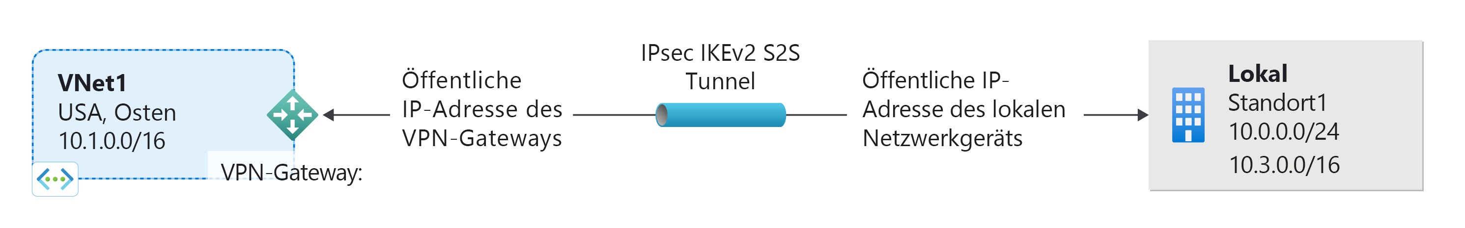 Eine VPN Gateway-S2S-Verbindung (Site-to-Site) ist eine Verbindung über einen VPN-Tunnel vom Typ „IPsec/IKE“ (IKEv1 oder IKEv2). Standort-zu-Standort-Verbindungen können für standortübergreifende Konfigurationen und Hybridkonfigurationen verwendet werden. Für Site-to-Site-Verbindungen wird ein lokales VPN-Gerät benötigt, dem eine öffentliche IP-Adresse zugewiesen ist.