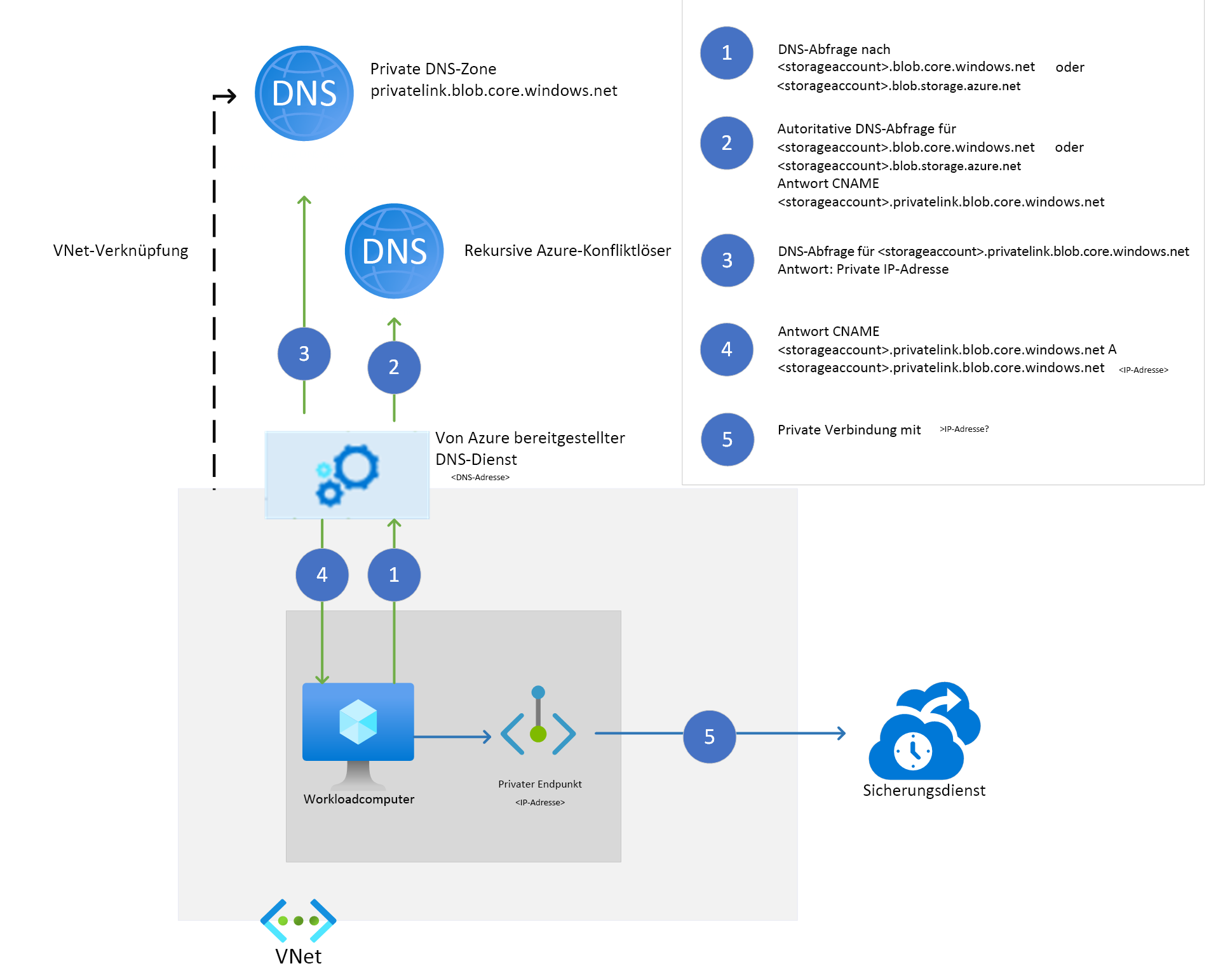 Bei einem Recovery Services-Tresor mit Einrichtung eines privaten Endpunkts sollte die Namensauflösung für die FQDNs (privatelink.<geo>.backup.windowsazure.com, *.blob.core.windows.net, *.queue.core.windows.net, *.blob.storage.azure.net) eine private IP-Adresse zurückgeben. Sie können dies erreichen, indem Sie Folgendes verwenden: