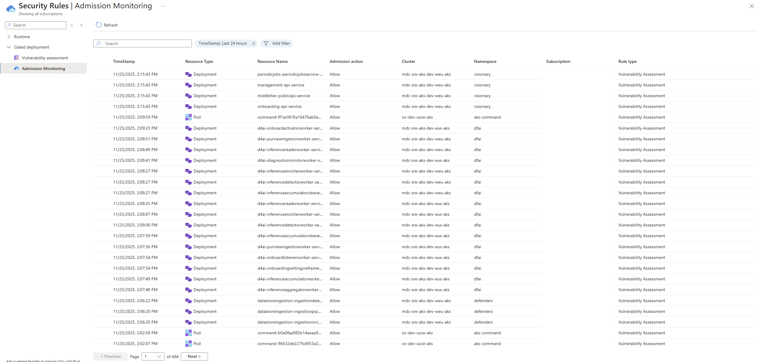 Gated Deployment-Ereignisse werden in der Ansicht "Zulassungsüberwachung " in Defender für Cloud angezeigt. Diese Ansicht bietet Einblicke in Regelauswertungen, ausgelöste Aktionen und betroffene Ressourcen. Verwenden Sie diese Ansicht, um Überwachungs- und Ablehnungsentscheidungen in Ihren Kubernetes-Clustern nachzuverfolgen.