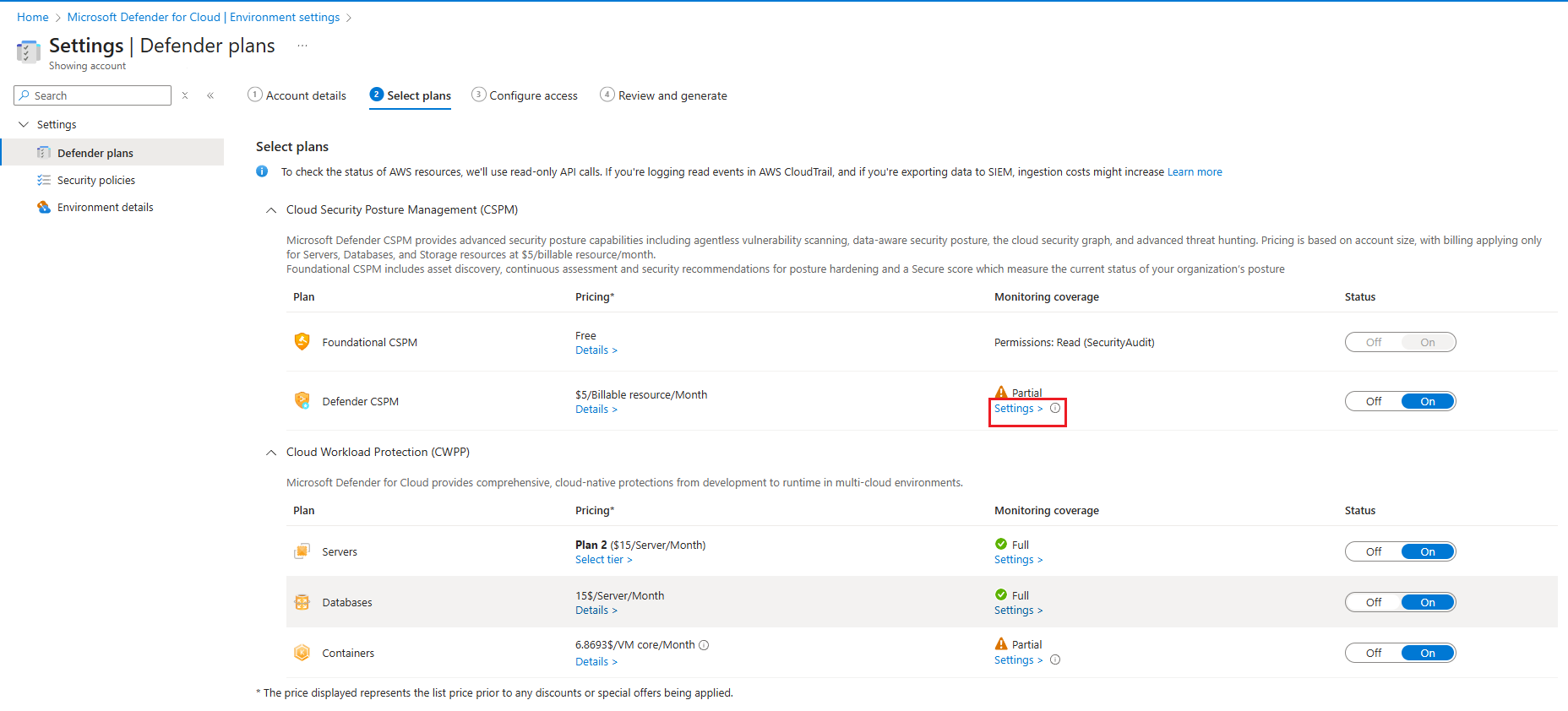 Defender CSPM-Plan, der im Azure-Abonnement aktiviert ist.