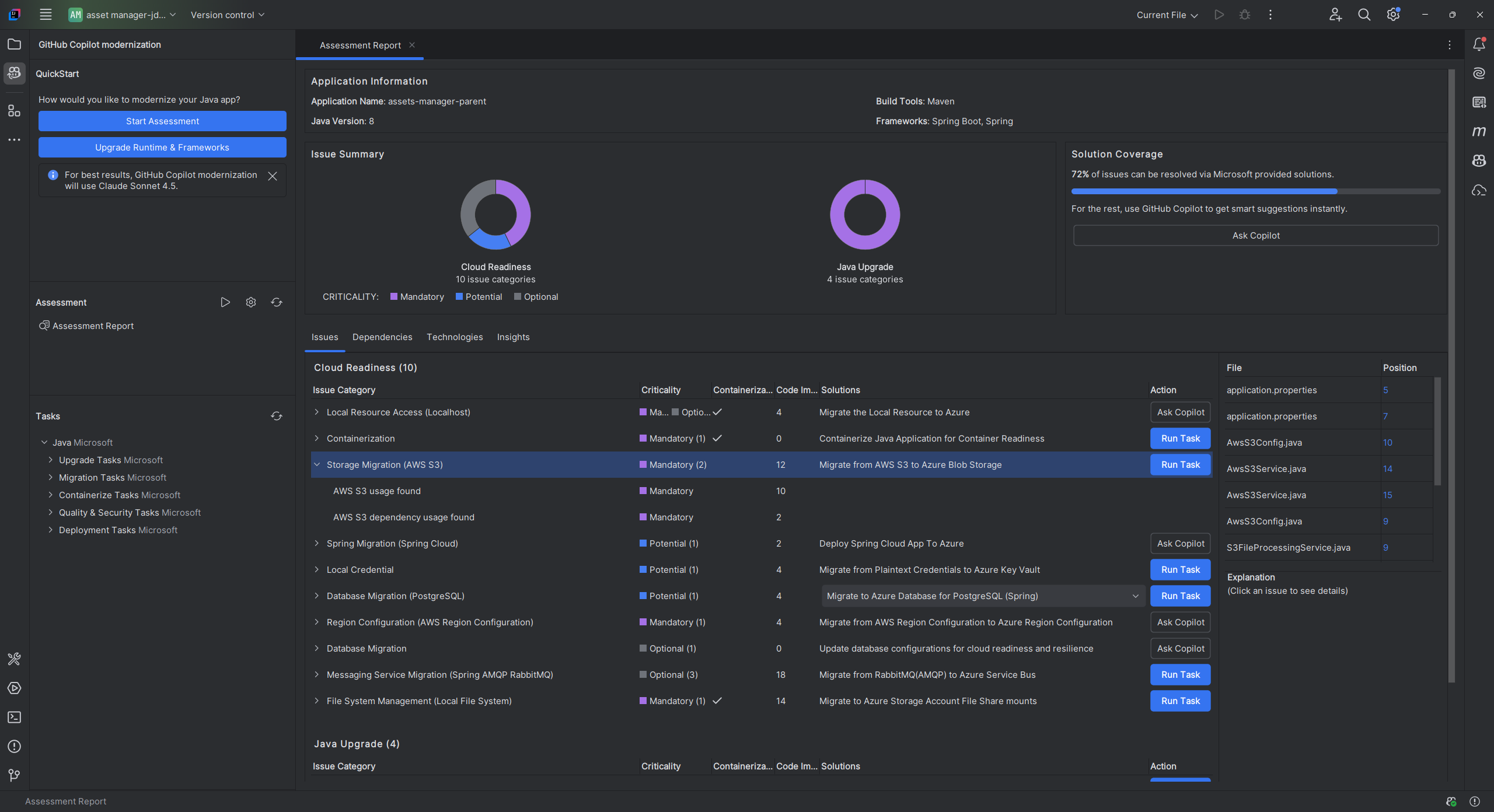 Der Bewertungsbericht bietet umfassende Analyseergebnisse, die Ihnen helfen, die Bereitschaft Ihrer Anwendung für die Azure-Migration und -Modernisierung zu verstehen. Dieser Abschnitt führt Sie durch die Berichtsstruktur und hilft Ihnen, die Ergebnisse zu interpretieren, damit Sie fundierte Migrationsentscheidungen treffen können.