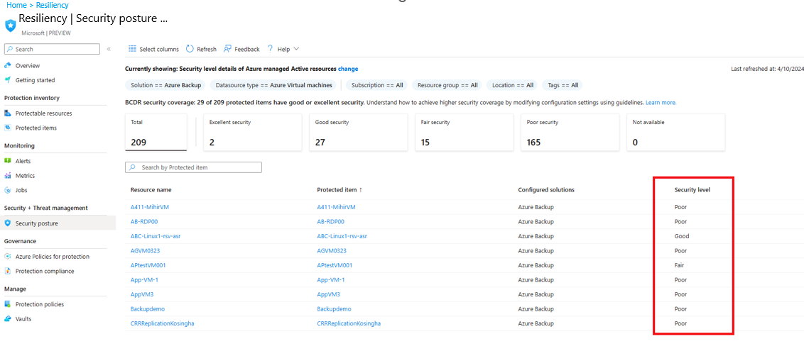 - Nicht verfügbar: Für Ressourcen, die von anderen Lösungen als Azure Backup geschützt werden, wird die Sicherheitsstufe als nicht verfügbar bezeichnet.
