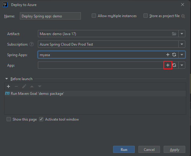Wählen Sie zum Starten der Bereitstellung unten im Dialogfeld In Azure bereitstellen die Schaltfläche Ausführen aus. Das Plug-In führt den Maven-Befehl package -DskipTests für die App demo aus und stellt die vom Befehl generierte package-Datei bereit.