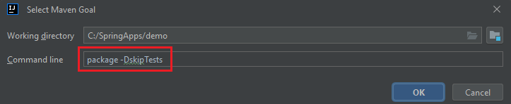Geben Sie im Textfeld Befehlszeile nach package die Zeichenfolge -DskipTests ein, und wählen Sie OK aus.