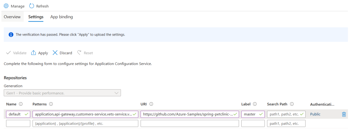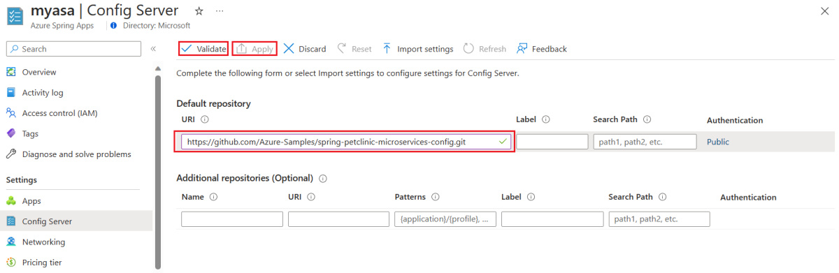 Geben Sie auf der Seite Config Server für URIhttps://github.com/Azure-Samples/spring-petclinic-microservices-config.git ein und wählen Sie dann Überprüfen aus.