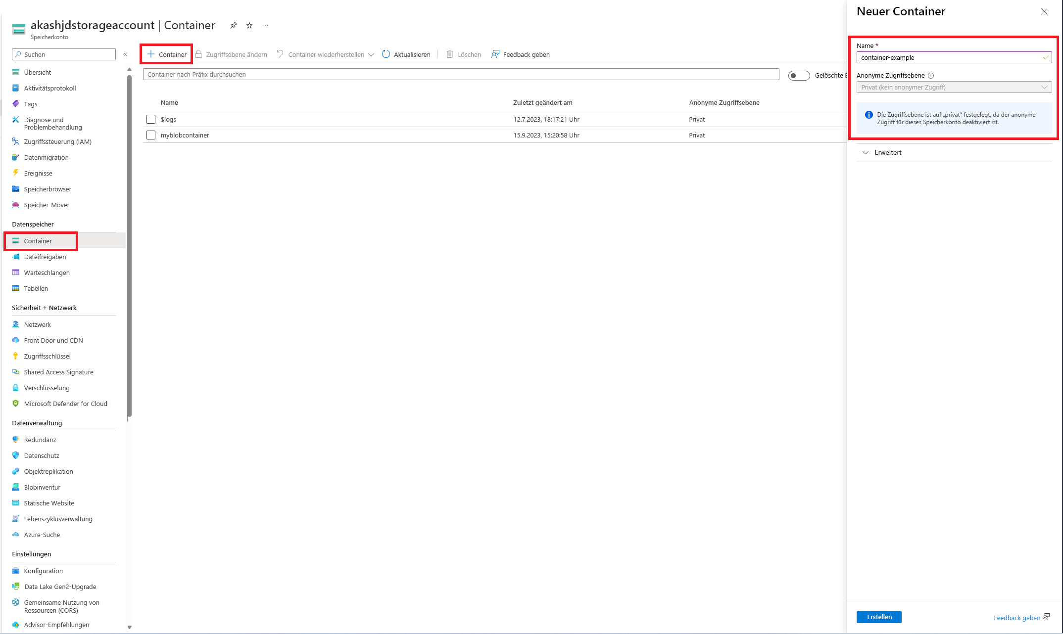 4. Geben Sie im Bereich "Neuer Container " einen Namen für den neuen Container an. Der Containername muss klein geschrieben werden, mit einem Buchstaben oder einer Zahl beginnen und darf nur Buchstaben, Zahlen und Bindestriche (-) enthalten. Der Name muss außerdem zwischen 3 und 63 Zeichen lang sein. Weitere Informationen zu Container- und Blobnamen finden Sie unter Benennen und Verweisen auf Container, Blobs und Metadaten.