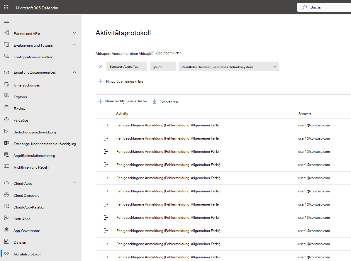 Sie können beispielsweise das Aktivitätsprotokoll verwenden, um Benutzer in Ihrem organization zu finden, die veraltete Betriebssysteme oder Browser verwenden: Nachdem Sie eine App mit Defender for Cloud Apps auf der Seite Aktivitätsprotokoll verbunden haben, verwenden Sie den erweiterten Filter, und wählen Sie Benutzer-Agent-Tag aus. Wählen Sie dann Veralteter Browser oder Veraltetes Betriebssystem aus.