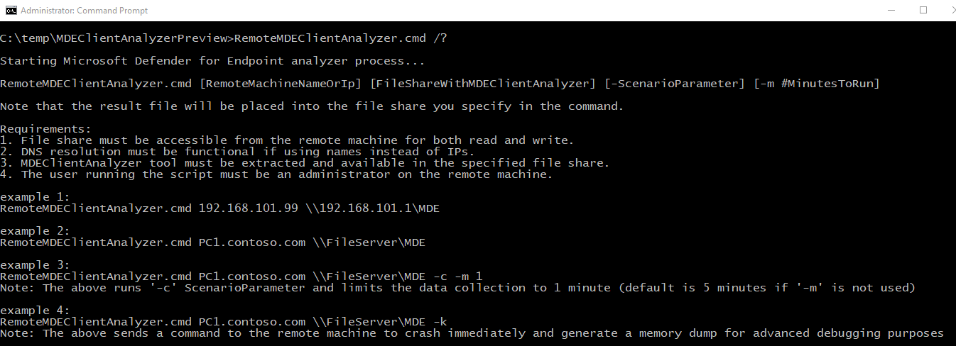 Führen Sie aus MDEClientAnalyzer.cmd /? , um die Liste der verfügbaren Parameter und deren Beschreibung anzuzeigen: