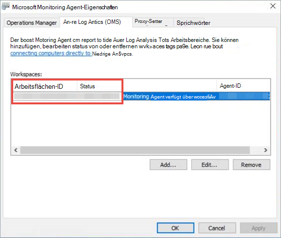 1. Wählen Sie in den Microsoft Monitoring Agent-Eigenschaften die Registerkarte Azure Log Analytics (OMS) aus.