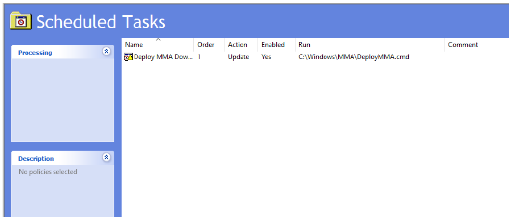 Dadurch wird auf jedem Server ein neuer Ordner hinzugefügt, auf den das Gruppenrichtlinienobjekt angewendet wird( mma genannt) und in c:\windows gespeichert wird. Diese enthält die Installationsdateien für das MMA, die erforderlichen Komponenten und das Installationsskript.