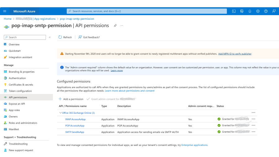 Hinzufügen der POP-, IMAP- oder SMTP-Berechtigungen zu Ihrer Microsoft Entra-Anwendung