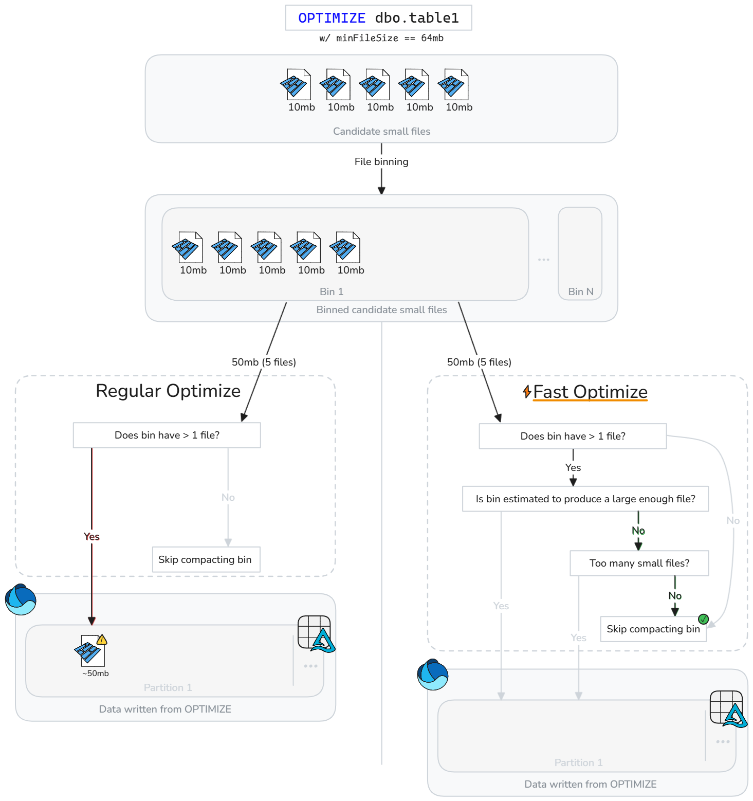 Schnelle Optimierung wertet jeden Bin kleiner Dateien aus und komprimiert nur die kleinen Dateien, die wahrscheinlich die minimale Zielgröße erreichen oder die minimale Dateianzahl überschreiten. Bins, die diese Schwellenwerte nicht erfüllen, werden übersprungen oder teilweise komprimiert. Das Überspringen suboptimaler Bins reduziert unnötige Neuschreibungen, verringert die Schreibverstärkung und macht OPTIMIZE-Aufträge mehr idempotent.