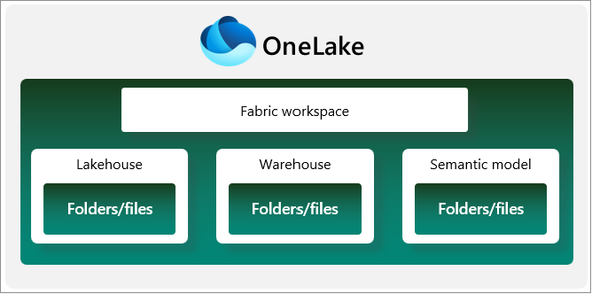 Diagramm, das den hierarchischen Aufbau von OneLake als Ordnerstruktur zeigt. OneLake/Arbeitsbereich/Element als Beispiel.