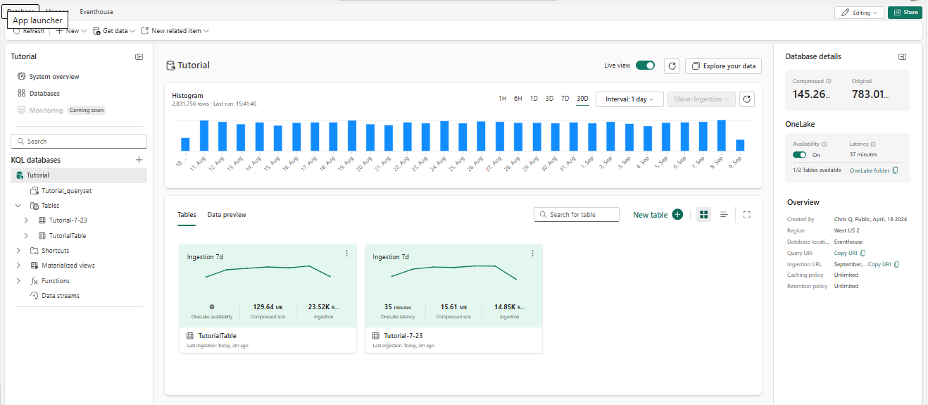 Die KQL-Datenbank ist nun im Kontext des ausgewählten Eventhouse erstellt.