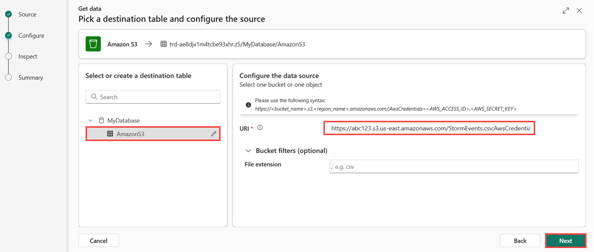 https://BucketName.s3.RegionName.amazonaws.com;AwsCredentials=AwsAccessID,AwsSecretKeyOptional können Sie Bucketfilter anwenden, um Daten nach einer bestimmten Dateierweiterung zu filtern.