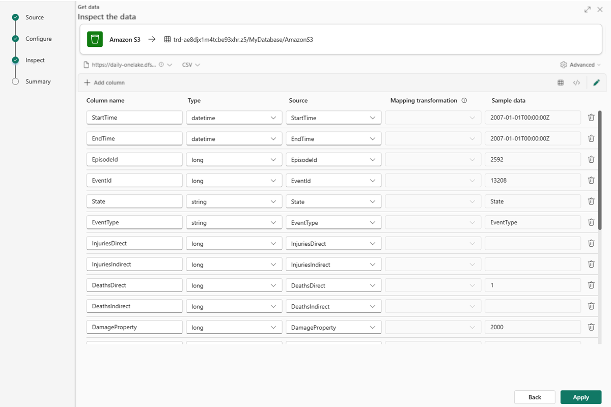 Zuordnungstransformationen können für eine Spalte vom Typ "Zeichenfolge" oder "datetime" ausgeführt werden, wobei die Quelle den Datentyp "int" oder "long" aufweist. Weitere Informationen finden Sie in der vollständigen Liste der unterstützten Zuordnungstransformationen.