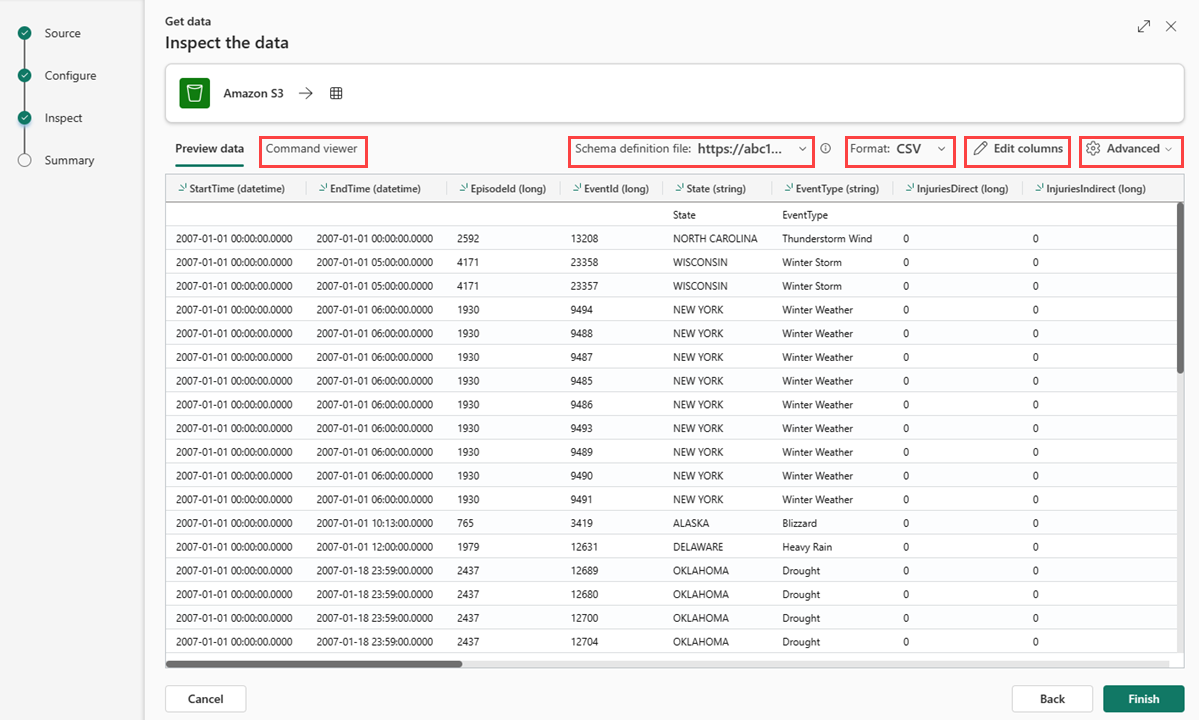(3) Ändern Sie das automatisch abgeleitete Datenformat, indem Sie das gewünschte Format aus der Dropdownliste auswählen. Weitere Informationen finden Sie unter Datenformate, die von Real-Time Intelligenceunterstützt werden.