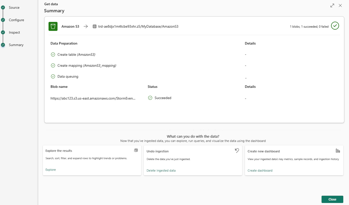 Im Datenvorbereitungsfenster sind alle drei Schritte mit grünen Häkchen gekennzeichnet, wenn der Datenimport erfolgreich abgeschlossen ist. Sie können eine Karte zum Abfragen auswählen, die aufgenommenen Daten löschen oder ein Dashboard Ihrer Datenaufnahmeübersicht anzeigen.