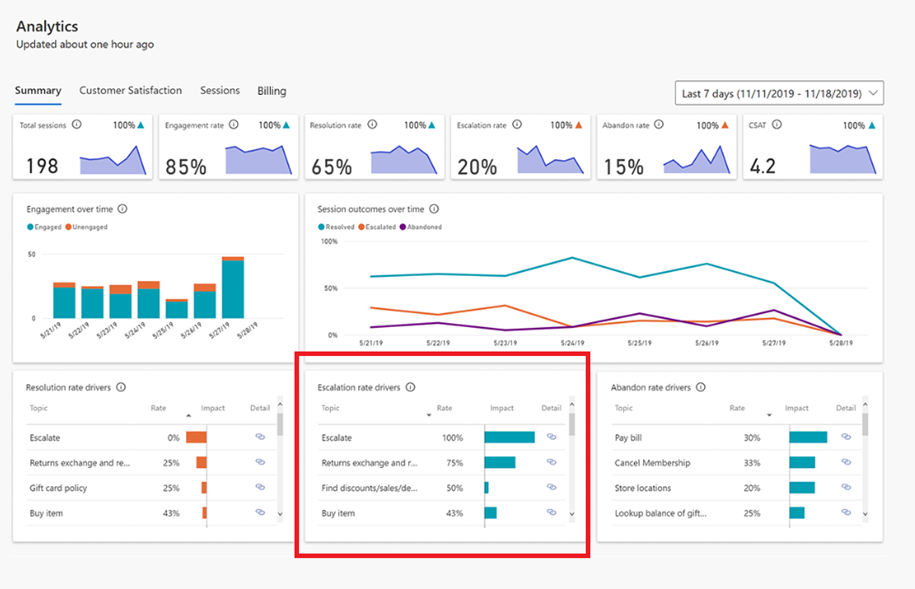 Das Analytics-Dashboard hat einen Abschnitt für "Escalation Rate Drivers", der Details darüber liefert, welche Agententhemen meist an menschliche Vertreter eskalieren und warum. Diese Informationen sind aus den Chat-Transkripten aus numerischer Sicht verfügbar.