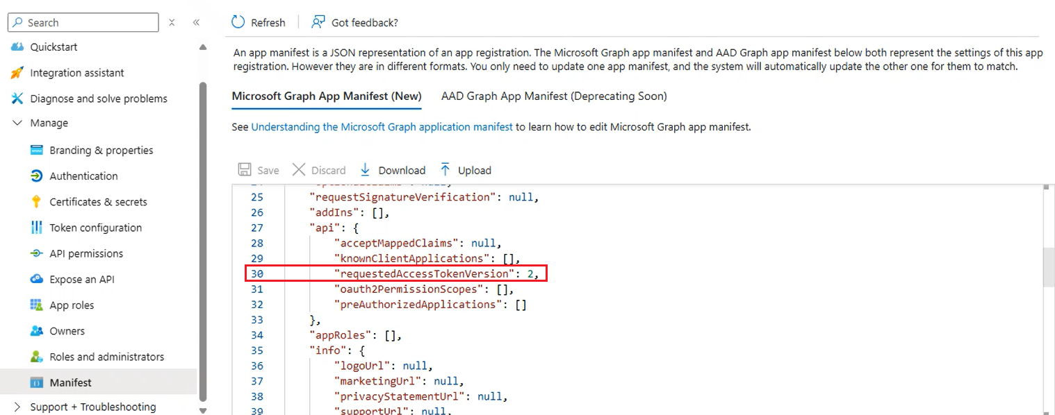 requestedAccessTokenVersionEigenschaft als 2.Klicken Sie auf Speichern.