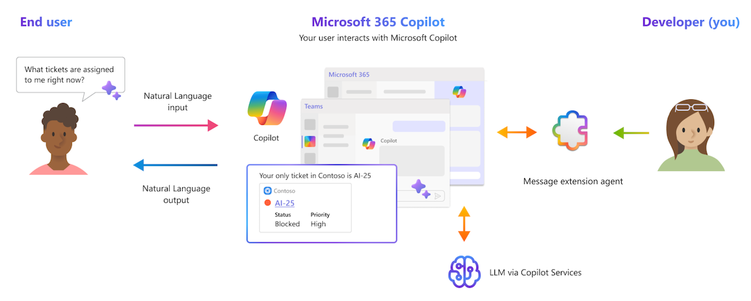 Microsoft 365 Copilot, das von einer erweiterten Verarbeitungs- und Orchestrierungs-Engine unterstützt wird, integriert Microsoft 365-Apps, Microsoft Graph und llMs (Large Language Models), um Ihre Wörter in ein leistungsstarkes Produktivitätstool zu verwandeln. Obwohl Microsoft 365 Copilot Apps und Daten innerhalb des Microsoft 365-Ökosystems nutzen können, verlassen sich viele Benutzer für die Arbeitsverwaltung und Zusammenarbeit auf verschiedene externe Tools und Dienste. Indem Sie Ihre Nachrichtenerweiterung als Agent in Microsoft 365 Copilot erweitern, können Sie Benutzern die Interaktion mit Tools und Diensten von Drittanbietern ermöglichen, damit sie mit Microsoft 365 Copilot mehr erreichen können. Sie können diese Erweiterung erreichen, indem Sie einen Agent entwickeln oder eine Verbindung mit einer externen Datenquelle herstellen.