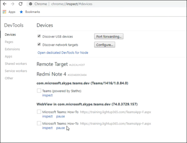 chrome://inspect/#devices.Wählen Sie unter der Registerkarte, die Sie debuggen möchten, Inspizieren aus, wie in der folgenden Abbildung: