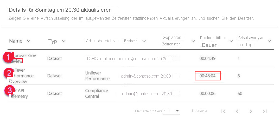 Bei dem Wert in der Spalte Refresh time booked (minutes) (Gebuchte Aktualisierungszeit (Minuten)) handelt es sich um den aus bis zu 60 Einträgen für jedes zugehörige semantische Modell errechneten Durchschnitt. Der numerische Wert für jeden 30-Minuten-Block ist die berechnete Gesamtanzahl von Minuten für alle geplanten Aktualisierungen, die in diesem Zeitraum starten sollen, und die, die im vorherigen Zeitraum starten sollen, deren durchschnittliche Dauer aber länger als der ausgewählte Zeitraum ist.