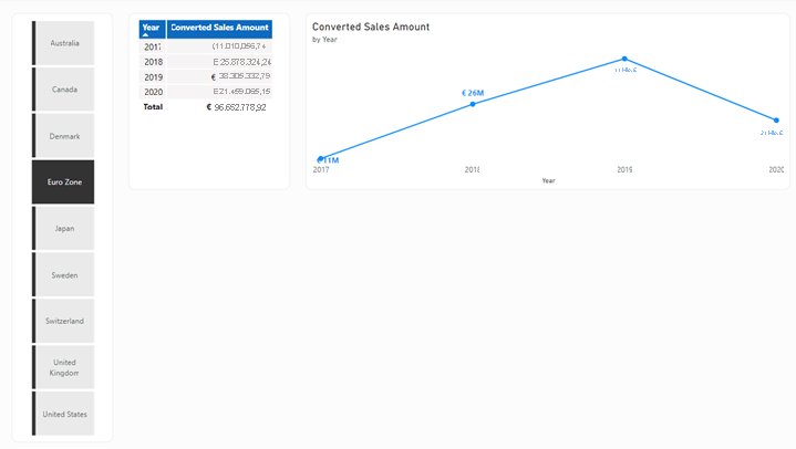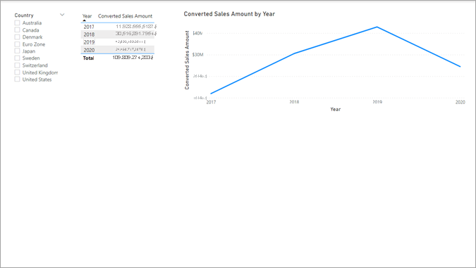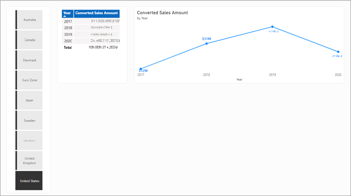Wählen Sie im Datenschnitt ein anderes Land/eine andere Region aus. Die Tabellen- und Liniendiagrammvisualisierungen zeigen nun den konvertierten Währungsbetrag in der richtigen Formatierung für dieses Land/diese Region an. Versuchen Sie, ein anderes Land bzw. eine andere Region im Slicer auszuwählen, um zu sehen, wie sich die Visuals ändern.