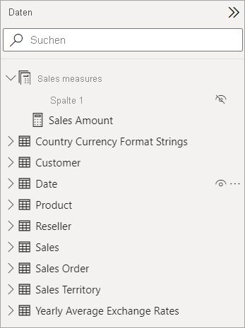 Klicken Sie in "Verkaufskennzahlen" mit der rechten Maustaste auf "Spalte1 ", und wählen Sie "In der Berichtsansicht ausblenden" aus. Durch diese Änderung wird Sales measures zu einer Maßgruppe, die nun oben im Datenbereich mit einem Maßgruppensymbol angezeigt wird, wie folgt: