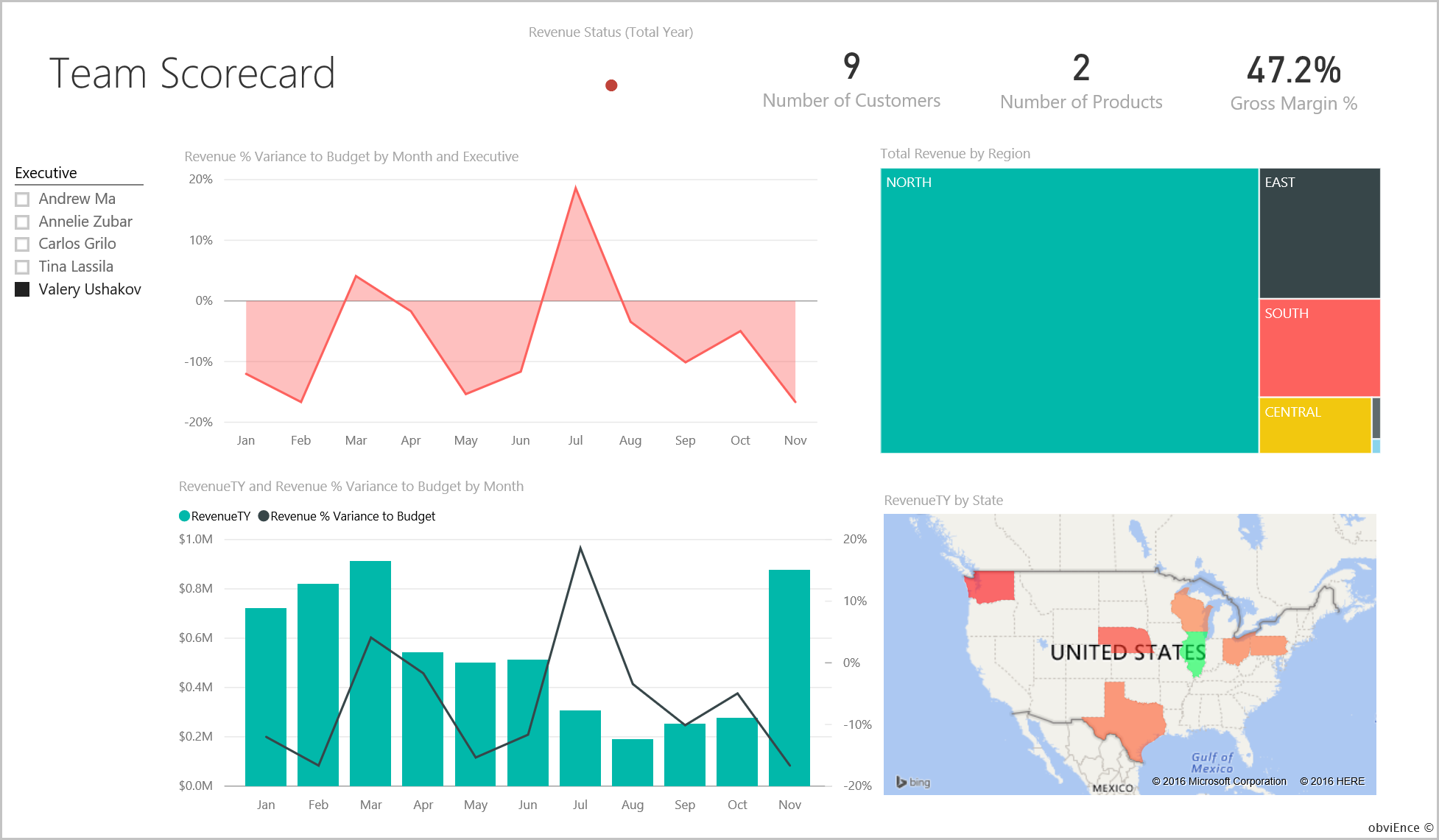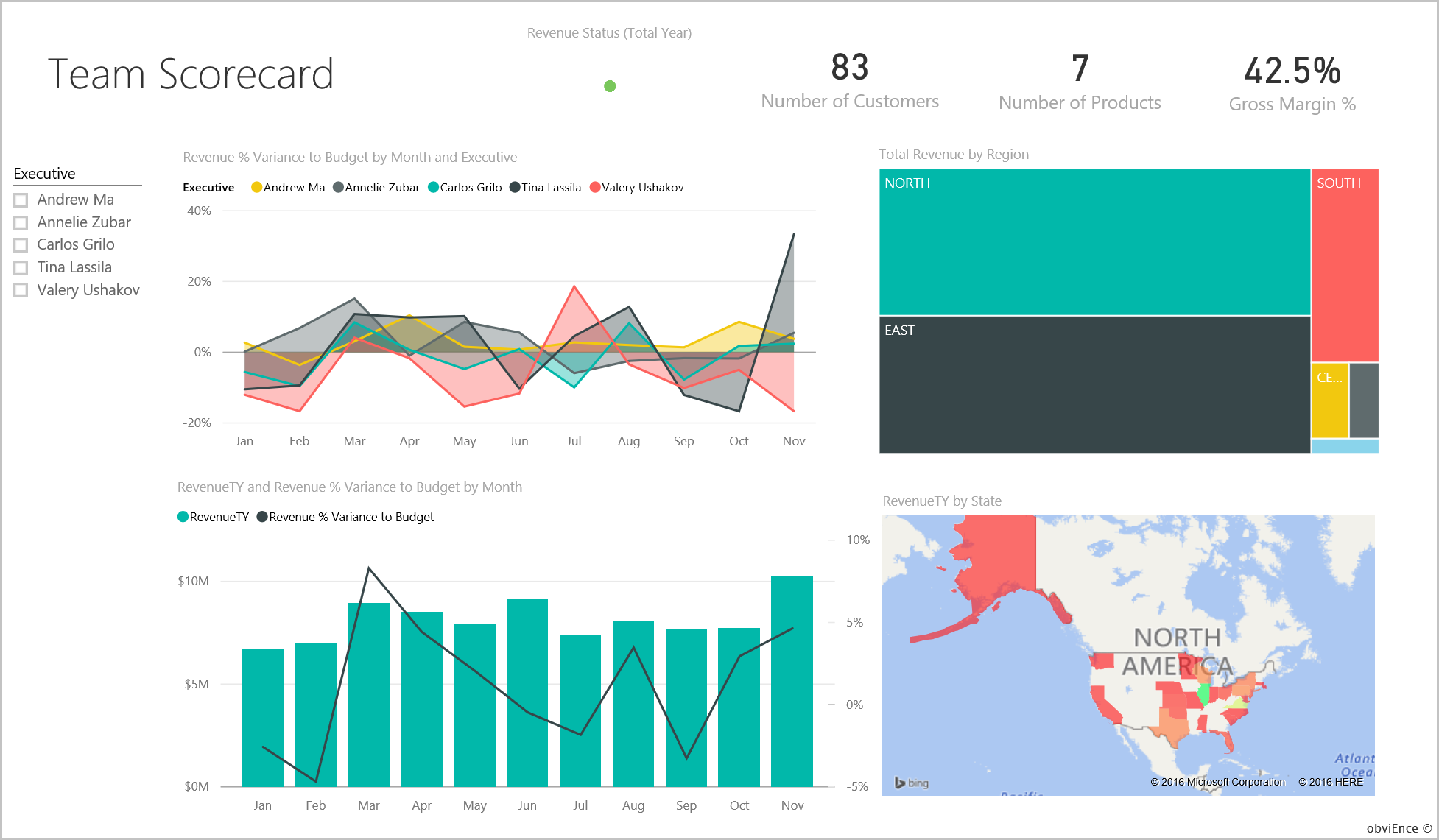 - Im Diagramm Revenue % Variance to Budget by Month and Executive (Umsatzabweichung in Prozent vom Budget nach Monat und Führungskraft) ist zu sehen, dass Andrew bis auf einen Einbruch im Februar gute Ergebnisse erzielt. Andrews wichtigste Region ist „East“ (Osten), zu der 49 Kunden und fünf von sieben Produkten gehören. Andrews Bruttogewinn in % ist weder der höchste noch der niedrigste.