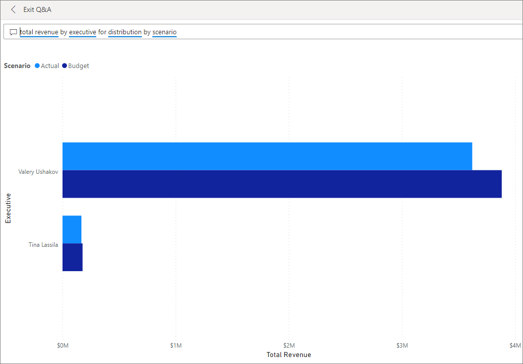 Um den tatsächlichen Umsatz anzuzeigen, wählen Sie im Dashboard das Q&A-Feld aus, und geben Sie Gesamtumsatz für Distribution nach Szenario und Führungskraft ein.