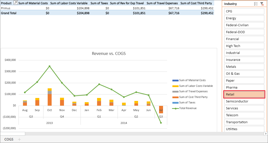 Der Gesamtumsatz überschreitet die Kosten deutlich. Die Linie für den Gesamtumsatz und die Höhe der Kostenbalken sind ähnlich. Interagieren Sie mit den Daten, indem Sie sie filtern, in Slices aufteilen, Drilling sowie weitere Aktionen durchführen. Betrachten wir beispielsweise Revenue vs COGS (Umsatz und Wareneinsatz) für nur eine Branche.