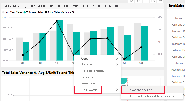 Im Letzten Jahr umsatz gibt es einen großen Rückgang zwischen März und April. Klicken Sie mit der rechten Maustaste auf den Verkaufsabweichungspunkt. Wählen Sie im Kontextmenü die Option Analyse>Abnahme erklären aus.