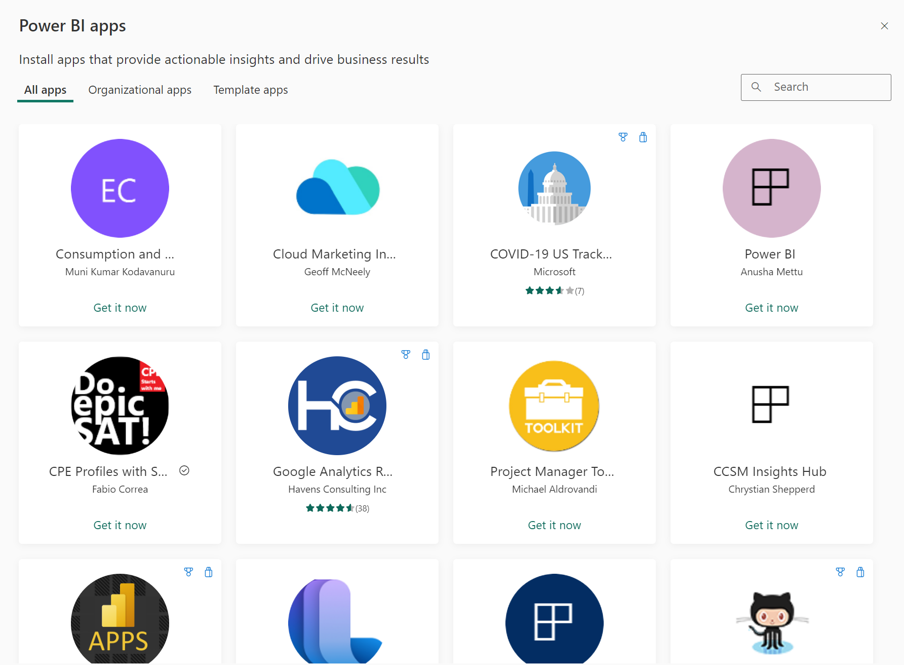Sie können Apps über den Power BI-Apps-Marketplace suchen und installieren. Im Apps-Marketplace können Sie sowohl nach Organisations-Apps als auch nach Vorlagen-Apps suchen.