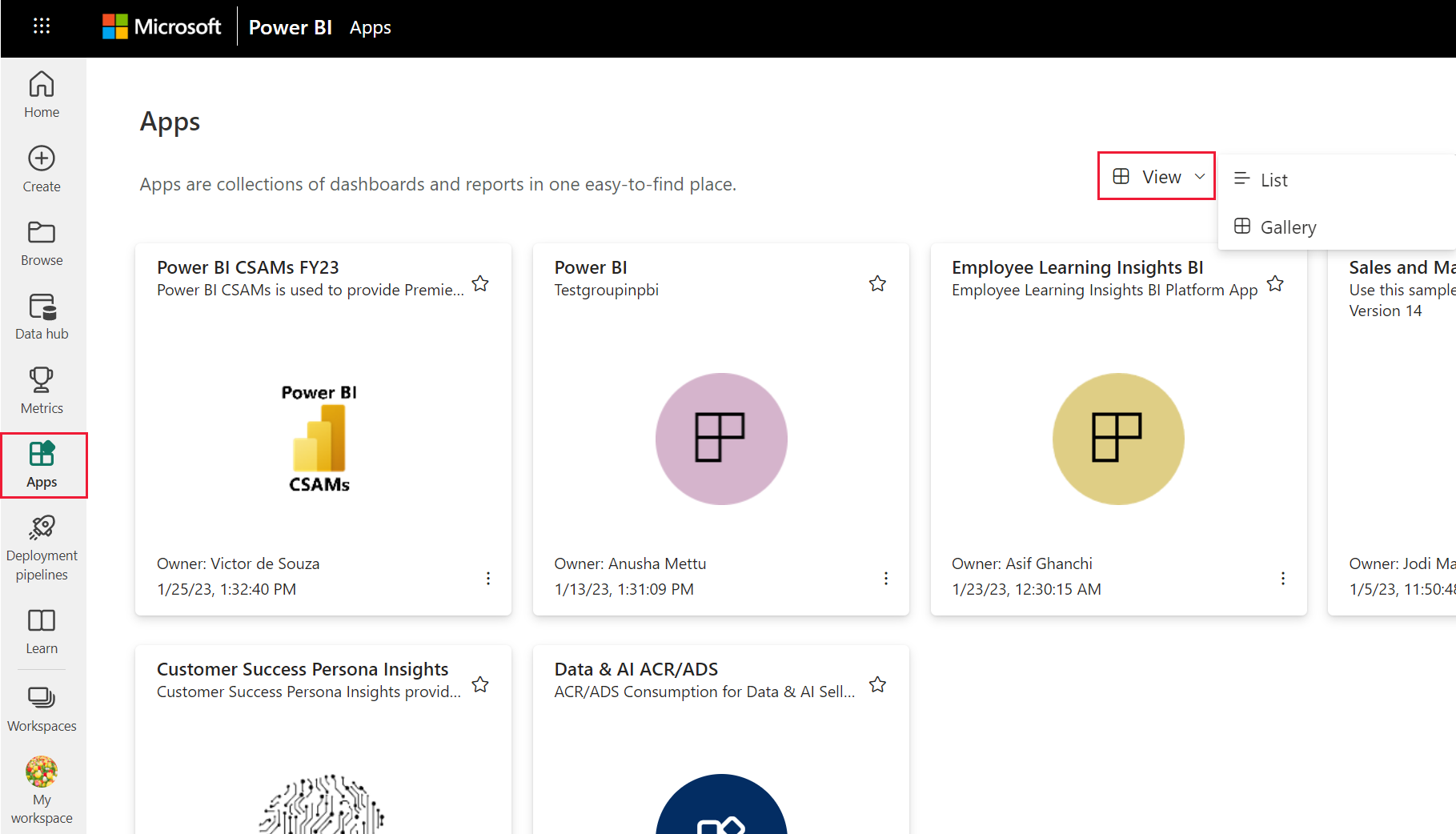 Nachdem Sie eine App installiert oder eine App von einem Kollegen erhalten haben, zeigen Sie sie in Ihrer App-Inhaltsliste an, indem Sie im Navigationsbereich Apps auswählen. Das folgende Beispiel zeigt die App-Seitenansicht, die auf Galerie festgelegt ist. Sie können Ansicht und dann Liste auswählen, um Ihre Apps als Liste anzuzeigen.