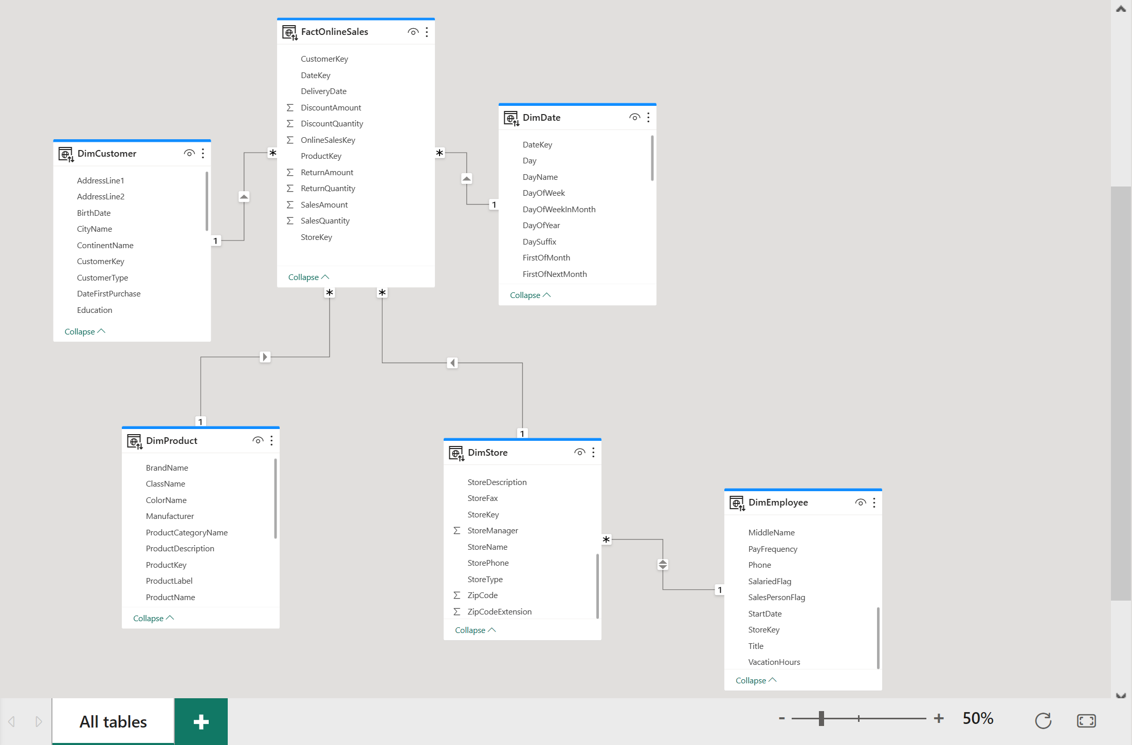 Diese Beziehung aktivieren Von: Tabelle 1 (Spalte) Zu Tabelle 2 (Spalte) Kardinalität Kreuzfilterrichtung ☑ FactOnlineSales (ProductKey) DimProduct (ProductKey) N zu Eins (*:1) Ledig ☑ FactOnlineSales (StoreKey) DimStore (StoreKey) N zu Eins (*:1) Ledig ☑ FaktOnlineVerkäufe (DateKey) DimDate (Datekey) N zu Eins (*:1) Ledig ☑ DimStore (StoreKey) DimEmployee (StoreKey) N zu Eins (*:1) Beide Die folgende Abbildung zeigt eine fertige Ansicht des Semantikmodells mit allen enthaltenen Beziehungen.